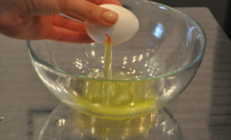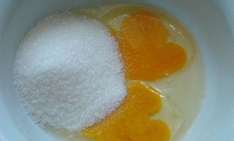- Bereid het koekjesdeeg voor de cakes als volgt: breek de eieren in een kom, voeg suiker toe en klop de eieren met suiker erdoor tot een dik, stabiel schuim ontstaat.