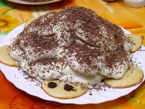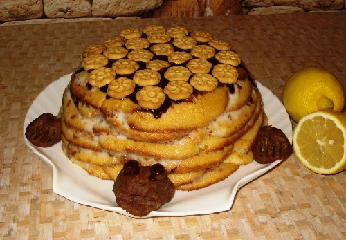 - Doop elke zandkoekcake goed in de room en vorm er vervolgens een schildpad van op een grote schaal. Het is belangrijk dat alle lagen van de cake dik verzadigd zijn met room, anders wordt de cake droog.