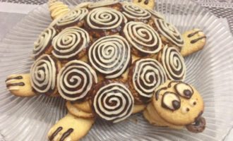 - Doop de koekjes in de hete room en vorm een schildpad op een schaal, en leg dan zijn kop, poten en staart opzij (voor de staart moet je een kleine cake bakken).