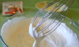 Klop vervolgens de eiwitten, die al afgekoeld moeten zijn, met een snufje zout en een half glas suiker tot sterke pieken (pas de hoeveelheid suiker in de cake naar eigen inzicht aan).