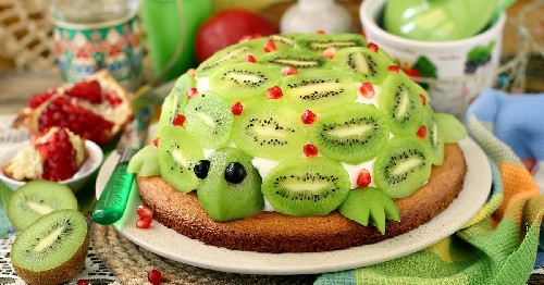 Het advies: indien gewenst kan dezelfde cake niet met kiwi worden versierd, maar met chocoladesuikerglazuur, en de kop, poten en staart van de schildpad kunnen worden gemaakt van plakjes banaan of van iets anders.