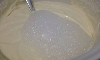 Voeg blanken, gebluste soda toe aan de dooiers en meng alles voorzichtig, roer met een spatel of mixer op een zeer lage snelheid. Voeg bloem in porties toe en roer alles telkens goed door zodat er geen klontjes zijn, maar de losgeklopte eieren er niet af vallen.