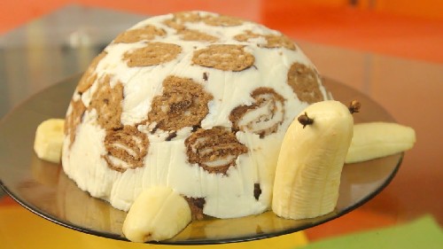 Wij bieden u aan om een zeer originele "Turtle" cake te maken: in tegenstelling tot de klassieke biscuitcake, worden hier ingrediënten zoals kwark, koekjes en bananen toegevoegd, en deze cake hoeft niet gebakken te worden!