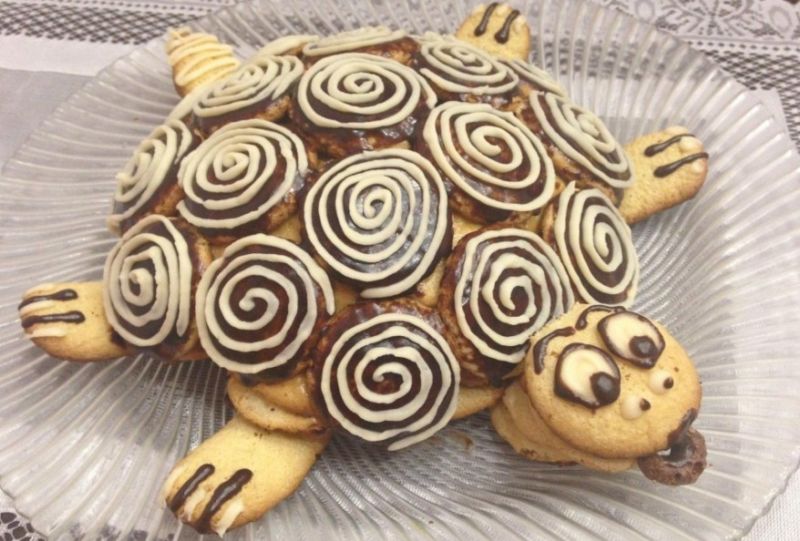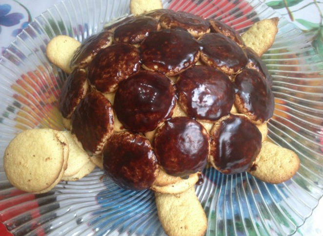 - Doop de koekjes in de hete room en vorm een schildpad op een schaal, en leg dan zijn kop, poten en staart opzij (voor de staart moet je een kleine cake bakken).