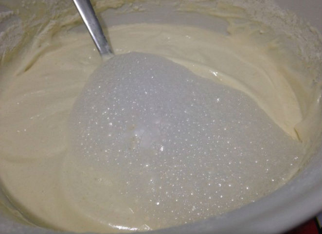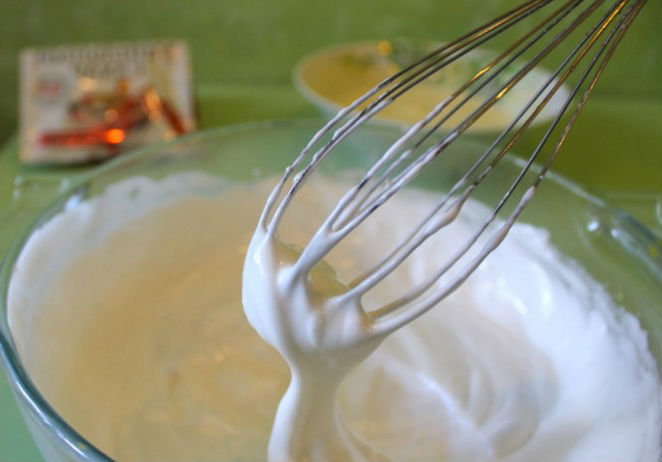 Klop vervolgens de eiwitten, die al afgekoeld moeten zijn, met een snufje zout en een half glas suiker tot sterke pieken (pas de hoeveelheid suiker in de cake naar eigen inzicht aan).
