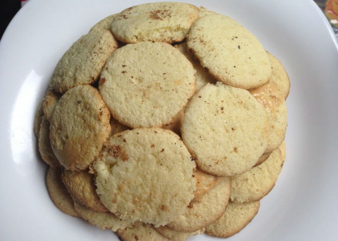 - Doop elke zandkoekcake goed in de room en vorm er vervolgens een schildpad van op een grote schaal. Het is belangrijk dat alle lagen van de cake dik verzadigd zijn met room, anders wordt de cake droog.