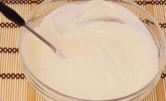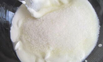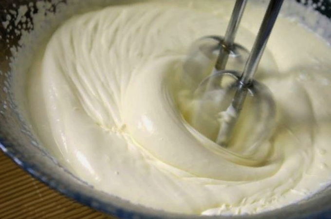 - Giet zure room in een diepe bak, voeg daar suiker toe. Meng deze ingrediënten met een gewone garde en laat de resulterende room 20 minuten opzij (u kunt het in de koelkast zetten). Gedurende deze tijd moet de suiker volledig zijn opgelost.