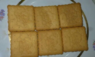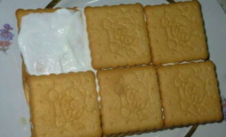 - Bereid de basis voor waarop de cake zal worden gemonteerd. Dit kan een ovenschaal zijn, een brede schaal of een gewone snijplank. We verspreiden de eerste laag koekjes, bedekken deze met gekookte zure room. Laat een koekje over om de afgewerkte cake te versieren.