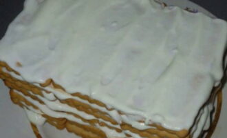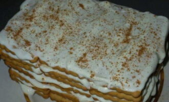- Op dezelfde manier verzamelen we de cake volledig - het is noodzakelijk om lagen koekjes en wrongelroom af te wisselen totdat deze ingrediënten op zijn. We zetten de cake minimaal 6 uur in de koelkast totdat deze volledig is uitgehard.