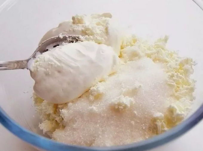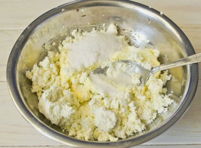 - We mengen kwark, zachte boter, vanilline en suiker.