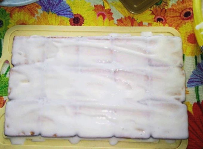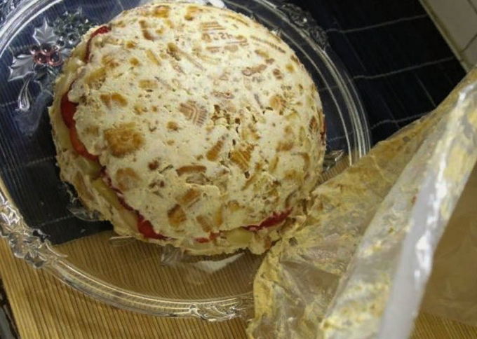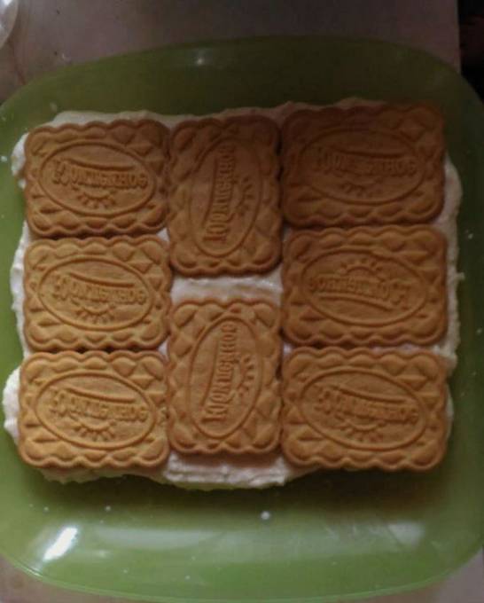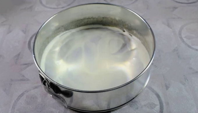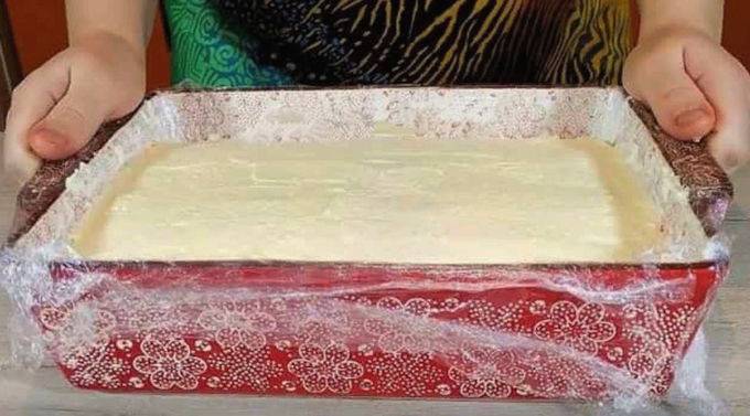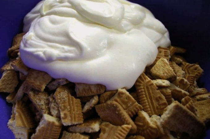- We bedekken de vorm met huishoudfolie, leggen de basis van koekjes op de bodem. We bedekken het met wrongelcrème.