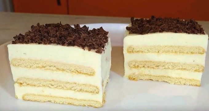 - Smeer de room op de biscuitlaag en leg de biscuits er weer op. Monteer op dezelfde manier de hele cake, afwisselend lagen vla en biscuit.Bestrijk de verzamelde cake aan alle kanten met room. Zet het dessert minimaal 5-6 uur in de koelkast.