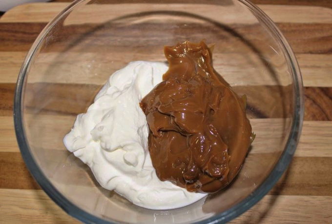 - Doe gekookte gecondenseerde melk in een handige container, voeg er zure room aan toe.