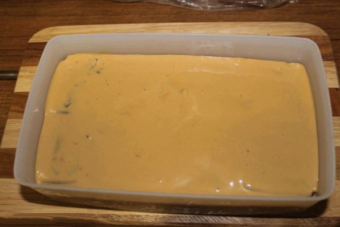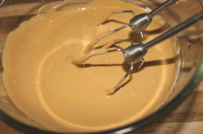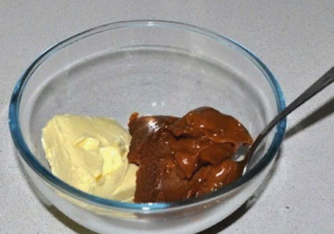 - We verspreiden de zachte boter en gecondenseerde melk in een diepe container.