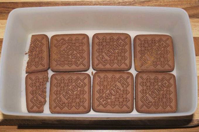 - Giet melk in een kleine container. Voordat de cake wordt samengesteld, moet elk koekje ongeveer 3-5 seconden in melk worden gedompeld.