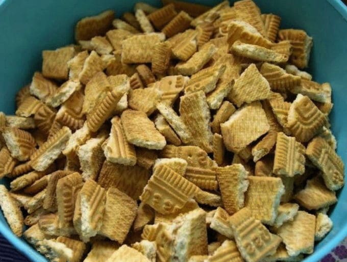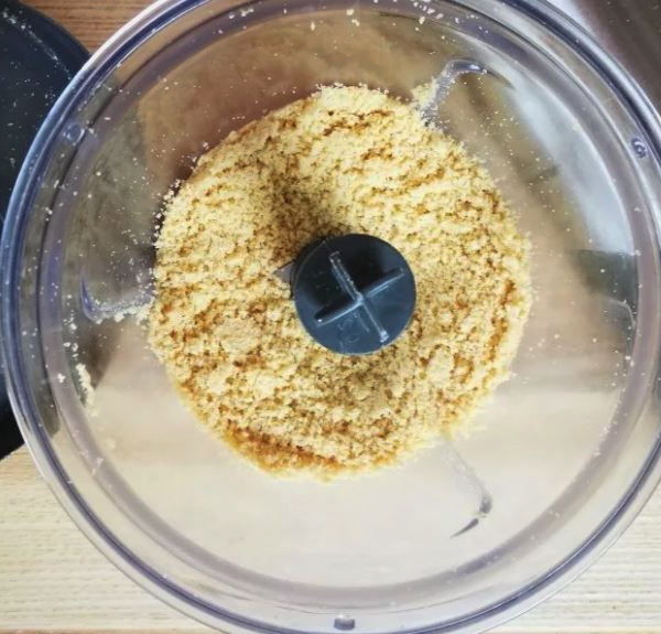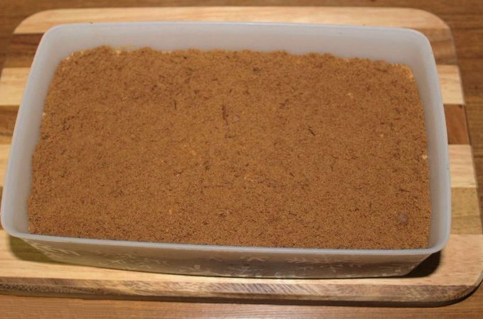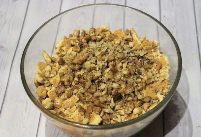 - Bereid koekjes voor - het moet in grote kruimels worden verpletterd. Dit kan met een blender of met een zak en deegroller.