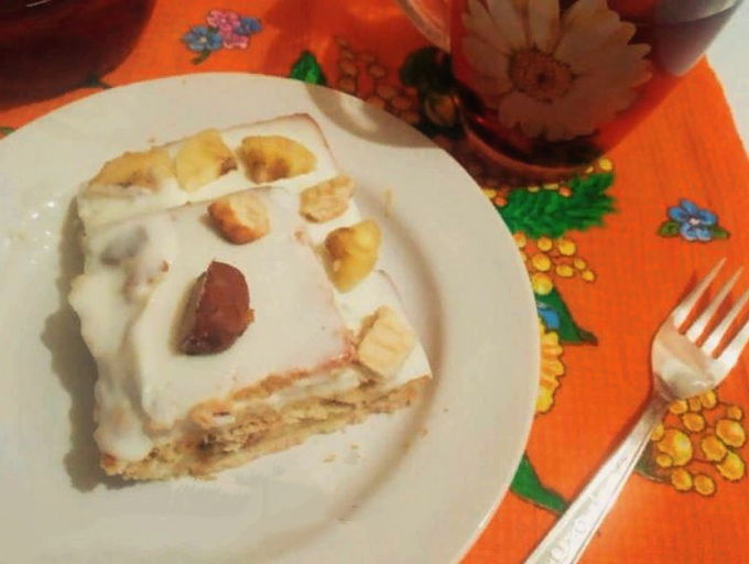 - Een cake zonder bakken van koekjes, bananen en zure room is klaar! Snijd het dessert in porties en help jezelf!