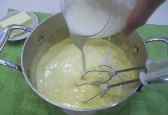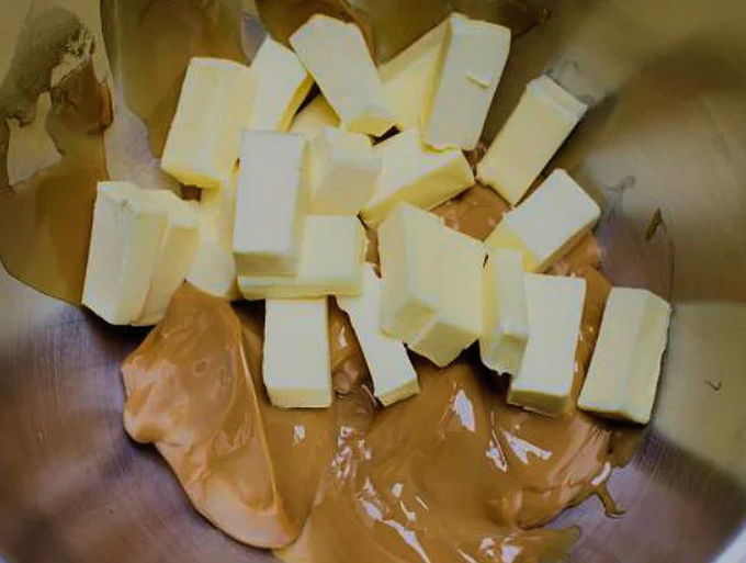 - Doe gekookte gecondenseerde melk en boter in een diepe kom.