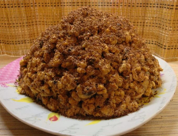 - De volgende stap is om de zoete massa op een platte schaal uit te smeren, een piramide te vormen in de vorm van een mierenhoop. We versieren het dessert met geraspte chocolade, zetten het minimaal 2 uur in de koelkast, en het liefst een nacht.