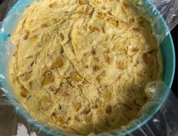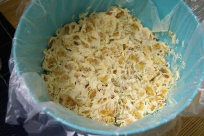- We sturen de resulterende room in een container met een droge basis, mengen alles met een lepel.De massa moet plakkerig zijn, niet droog of te nat.