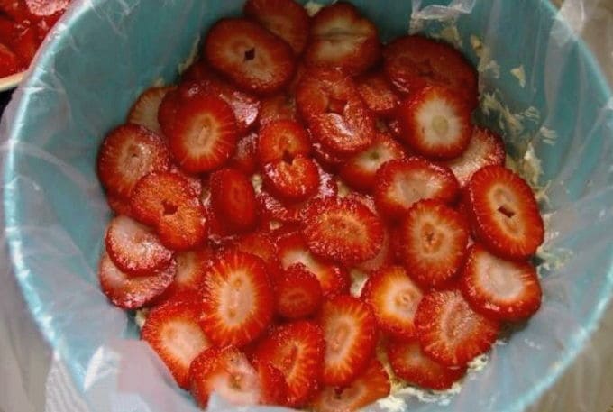 - Garneer met aardbeien en ananas. Zet de cake ongeveer 6 uur in de koelkast (bij voorkeur een nacht).