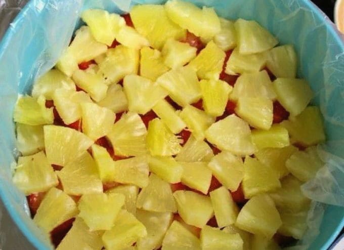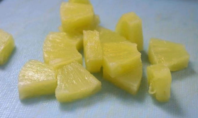 - Ananas moet in kleine stukjes worden gesneden - in 6-8 stukjes.
