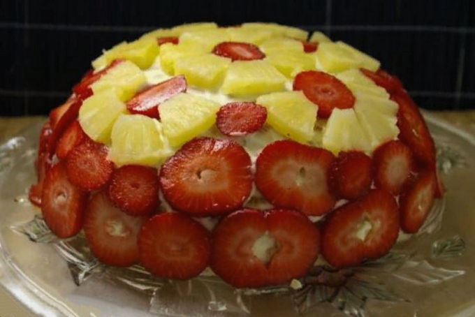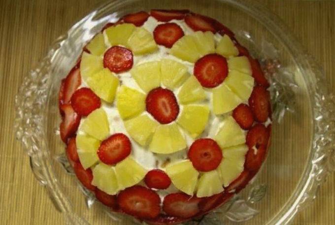 - Een cake zonder bakken van koekjes met fruit, zure room en gelatine is klaar!
