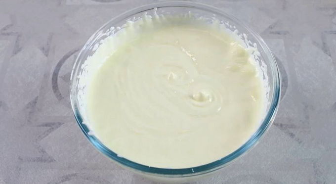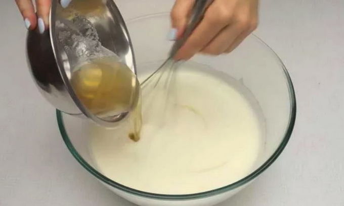 - Giet daarna gesmolten gelatine in de zure room, klop alles opnieuw.