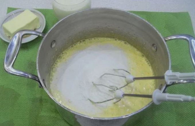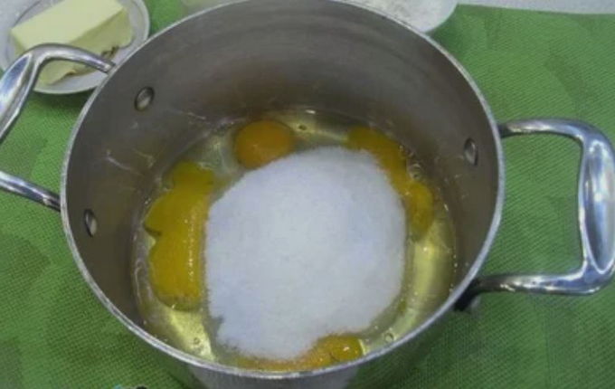 - We rijden eieren in een pan, voegen er suiker aan toe.