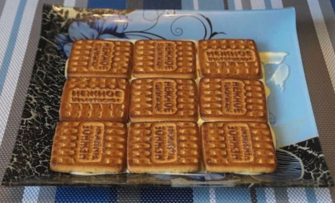 - Een eenvoudig en snel recept voor een cake gemaakt van Yubileynoye-koekjes zonder te bakken