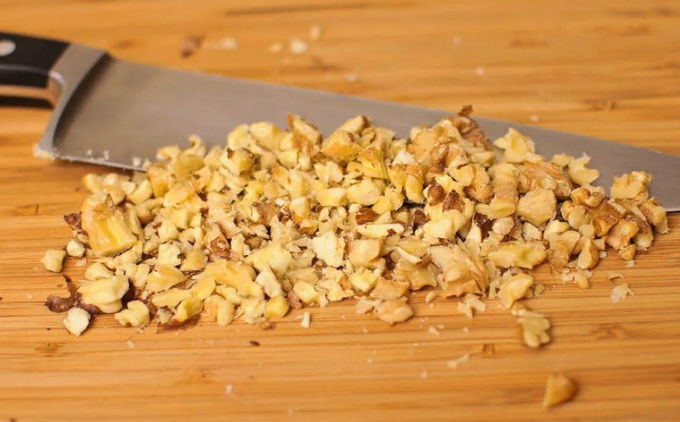 - We pletten de walnoten en doen ze in een bak met gehakte koekjes.