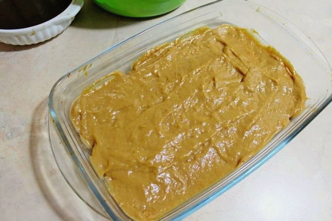 - We maken een geschikte container klaar. We smeren een laag "Yubileinoye" -koekjes op de bodem en bestrijken deze vervolgens royaal met kwarkroom. Leg na de room de biscuitlaag weer neer.