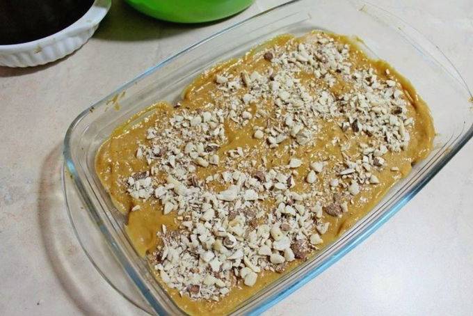 - Evenzo, afwisselende lagen koekjes, room en pinda's, verzamel de hele cake. We zetten het dessert minimaal 6 uur in de koelkast.