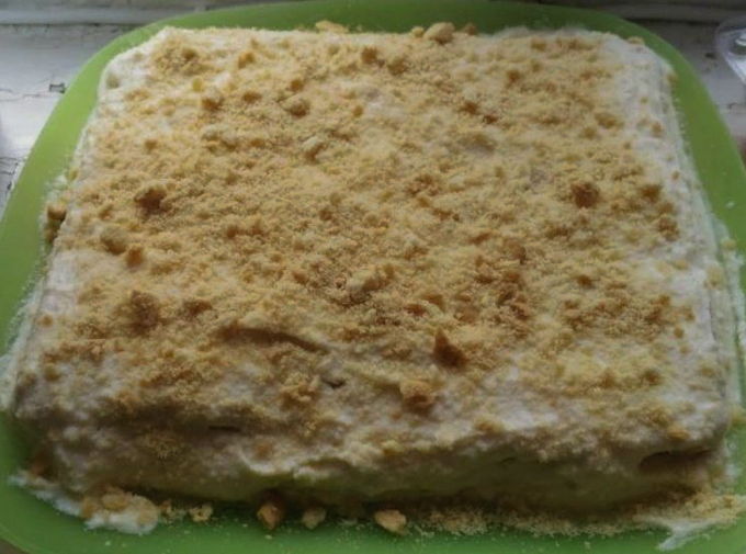 - Stap voor stap, afwisselend laagjes kwark en koekjes, verzamel de hele cake. Bestrijk met de resterende room voorzichtig het hele oppervlak van de cake. Je kunt de afgewerkte cake versieren met koekkruimels. Zet de traktatie minimaal 3 uur in de koelkast. Taart van koekjes "Yubileinoe" zonder bakken is klaar!