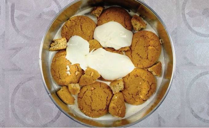 - Leg vervolgens een laag havermoutkoekjes, die we bedekken met een zachte crème.