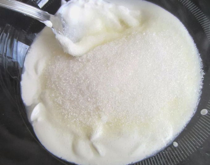 - Giet zure room in een diepe bak, voeg daar suiker toe. Meng deze ingrediënten met een gewone garde en laat de resulterende room 20 minuten opzij (u kunt het in de koelkast zetten). Gedurende deze tijd moet de suiker volledig zijn opgelost.