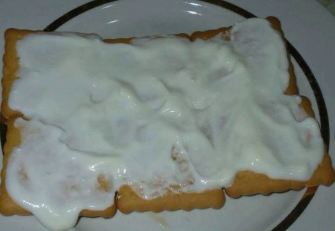 - Verdeel de bereide room van gecondenseerde melk en boter gelijkmatig over de koekjes.
