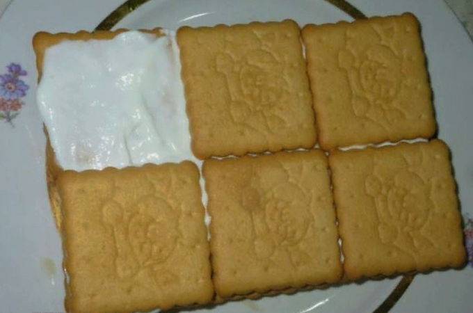 - Bereid de basis voor waarop de cake zal worden gemonteerd. Dit kan een ovenschaal zijn, een brede schaal of een gewone snijplank. We verspreiden de eerste laag koekjes, bedekken deze met gekookte zure room. Laat een koekje over om de afgewerkte cake te versieren.