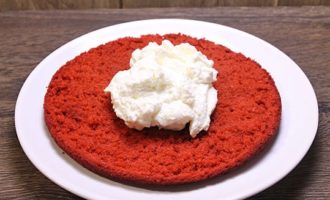 Als alle voorbereidende processen achter de rug zijn, is het tijd om de taart in elkaar te zetten. Leg de eerste korst op een schaal en doe er wat room op. Verdeel de room met een spatel gelijkmatig over het oppervlak van de cake.