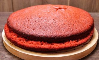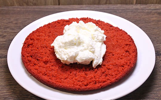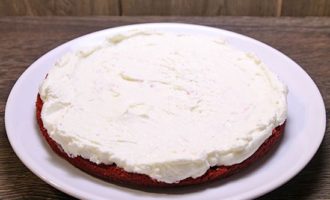 - Leg de eerste korst op een schaal, doe er wat room op en strijk het glad. Druk op de laag en herhaal de procedure. Vet ook de bovenste laag van de cake in met room en bestrooi met rode kruimels. Zet het eindproduct minimaal een paar uur in de koelkast om te laten weken.