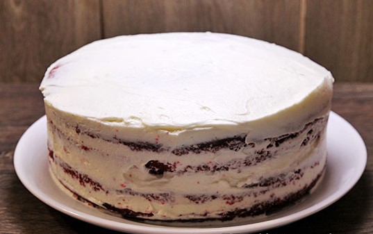 - Vet ook de bovenste laag van de cake royaal in met room en vet de zijkanten van de cake in. Gebruik een spatel of mes om de crème over het oppervlak en de zijkanten van de cake glad te strijken, zodat deze perfect glad is.