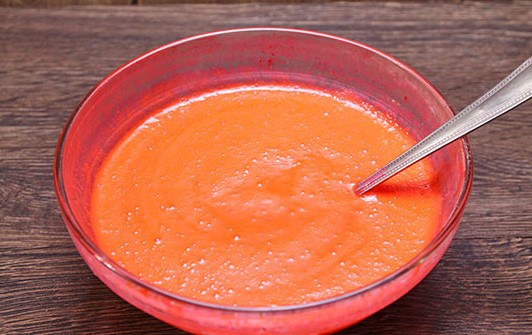 - Klop de bieten in een blender en voeg er kristalsuiker en kippeneieren aan toe. Klop grondig en tot een gladde massa.