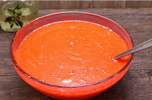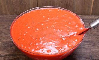 - Voeg rode kleurstof toe aan een vloeibaar mengsel van soda en kefir, meng grondig om een uniforme kleur en gelijkmatige verdeling van de kleurstof te verkrijgen. Giet geraffineerde plantaardige olie in het heldere mengsel, dat geen geur heeft.