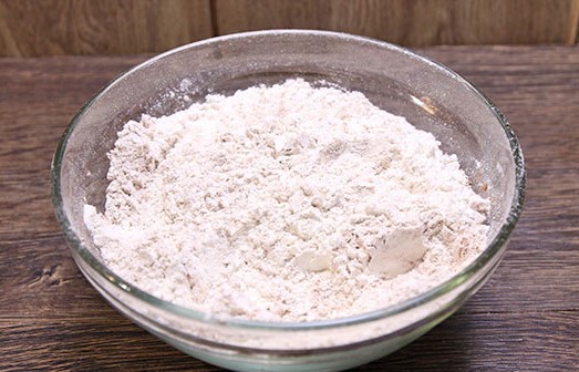 - Begin met het combineren van alle losse deegingrediënten in een handige kom. Dit zijn zout, kristalsuiker, premium bloem, bakpoeder en bakpoeder. Meng al deze componenten voorzichtig en verdeel ze gelijkmatig over elkaar.