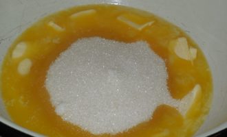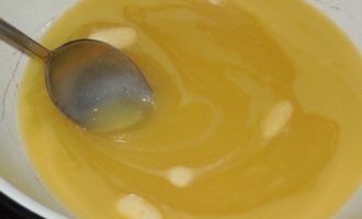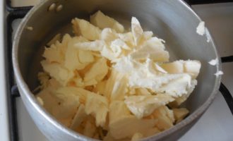 - Smelt boter in een pan, voeg daar gekookte gecondenseerde melk toe en blijf verwarmen.