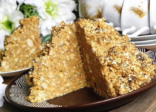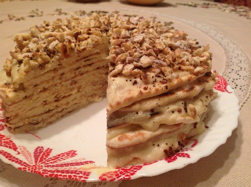 Een zeer ongebruikelijke cake: hier wordt het deeg niet in de oven gebakken, maar in een pan gebakken, er wordt geen suiker aan toegevoegd. Alles is op smaak gebracht met roomsaus op basis van honing.