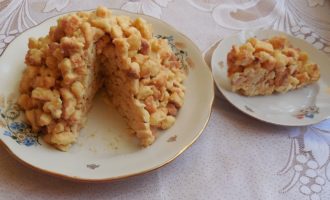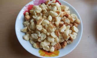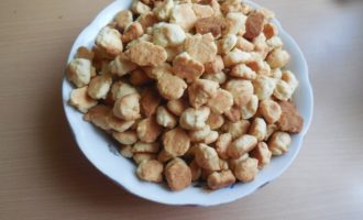 - Bak ongeveer 15 minuten op de aangegeven temperatuur. tot rossig en goudbruin, eruit halen, afkoelen. Breek het deeg met je handen in kleine stukjes.