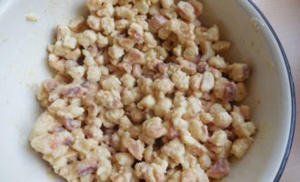 Nadat het deeg is afgekoeld, breek je de bolletjes van het deeg met je handen in kleine stukjes en giet je ze in een diepe kom. Giet alle room in dezelfde kom en meng dit met de zandkruimels.