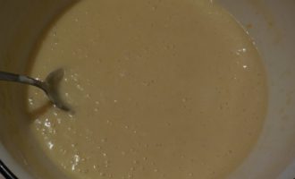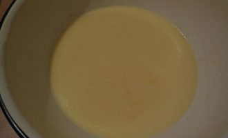 - Giet melk en gesmolten boter bij het eimengsel, roer tot een glad mengsel.