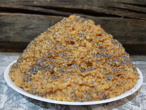 - Verwijder dit glazuur in de kou gedurende 15-20 minuten en giet het dan over de reeds gevormde cake. Strooi kokos- of maanzaad gelijkmatig over de bovenkant.
